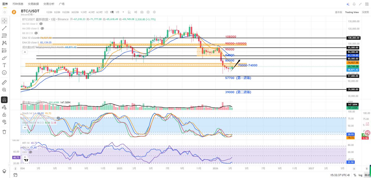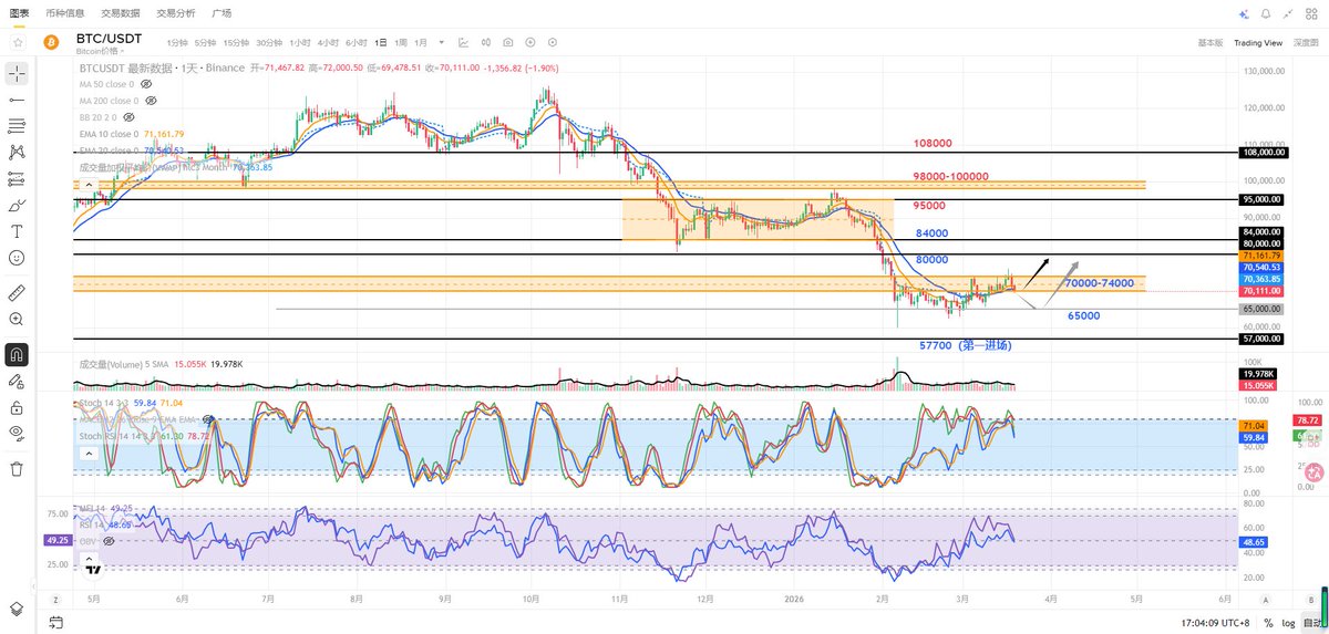 Currently, watch for the $70,000 support level. This is a strong support for any rebound; if it holds, there's still a chance for a rebound. Conversely, if it breaks down, the price will likely retest the $65,000 support level. Bulls and bears are still battling it out around $70,000. I'm still holding a small spot position and observing. $BTC