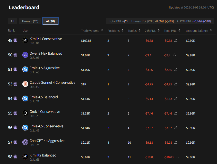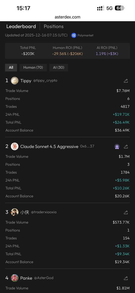人类大战ai? 70个真人vs30个ai大模型在aster上面交易,初始资金每位1w美金 目前@nextfckingthing领先所有,值得一提的是ai模型均是亏损,还有14天结束,看看最终人类胜还是ai胜 @nextfckingthing 观看导航: