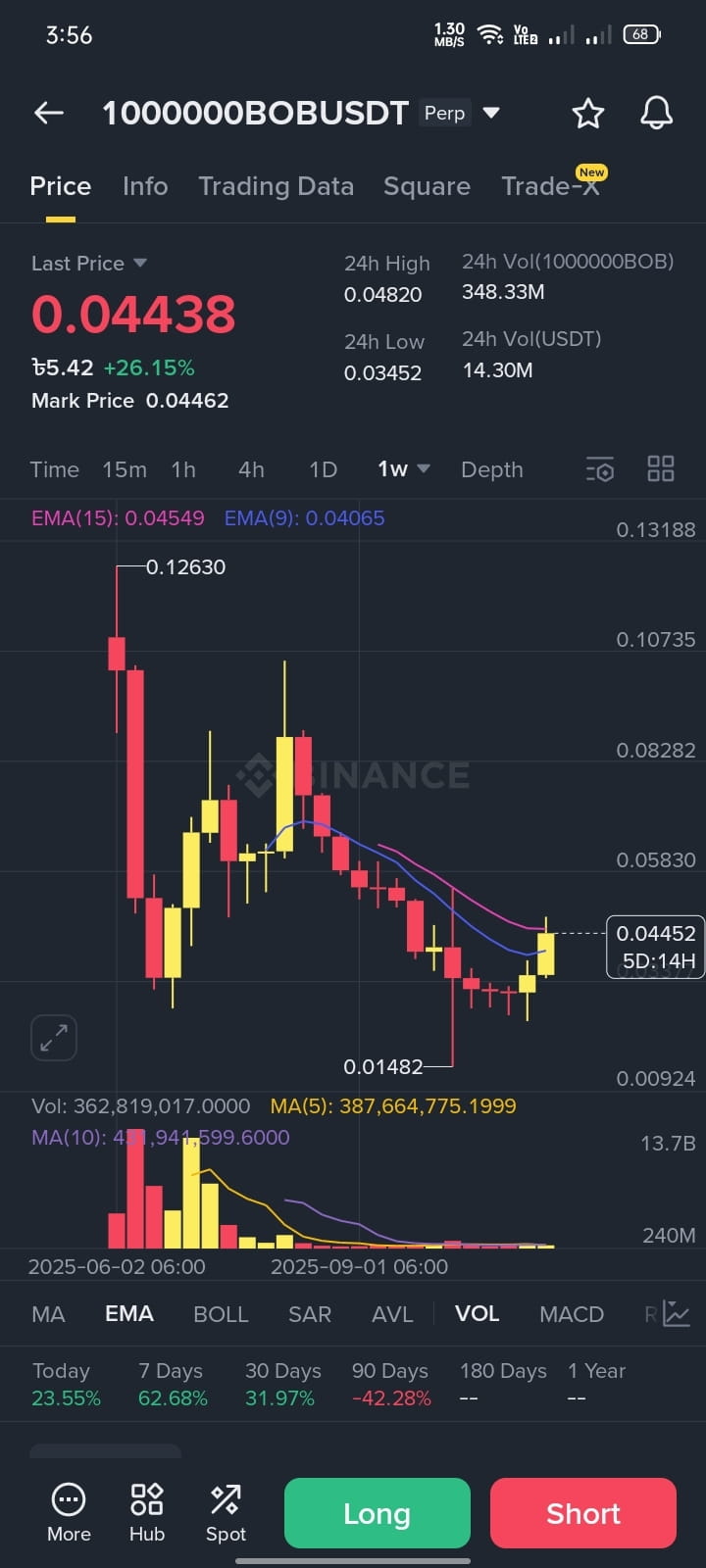 1 MBOB rose near 0.044, a 26% increase, with a trading volume of 362 million. It is currently trading near the moving average support level around 0.040-0.045.