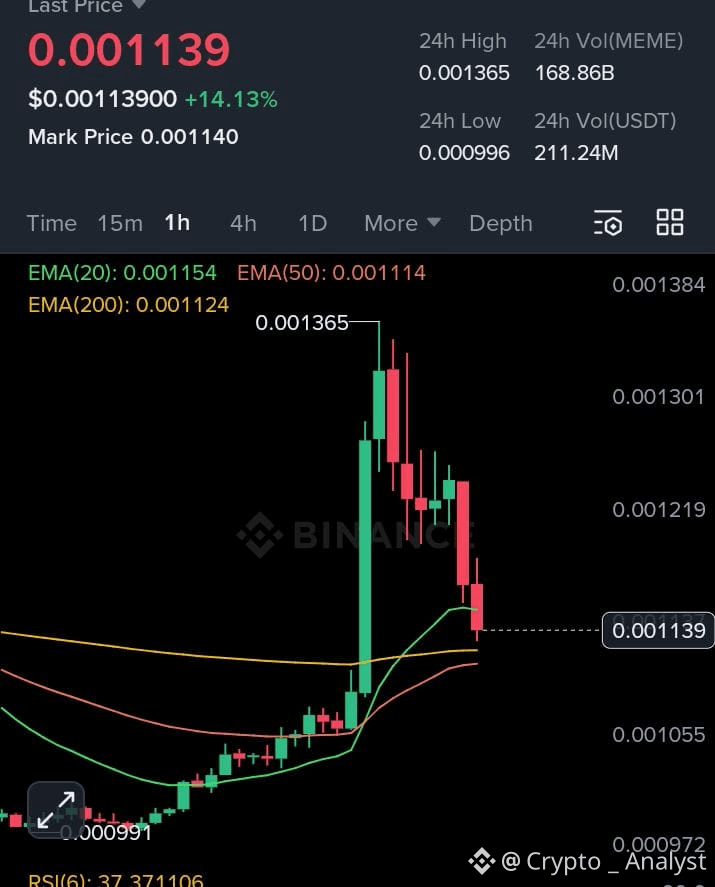 Price surged to 0.00130–0.00140 before encountering resistance and falling back. Sellers are in control, creating lower highs and increasing pressure. As long as $MEME remains below 0.00132, the downtrend is expected to continue.
