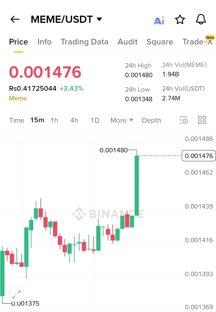 💰 Current Price: 0.001476 MEME ≈ ₹0.41725 (+3.43%)