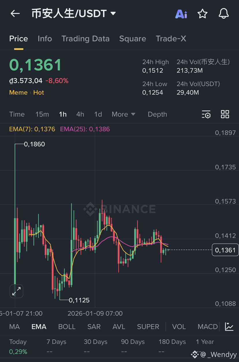 Current Price: $0.1361 (down 8.6% in the last 24 hours). The price broke below the 7/25 moving average on the 1-hour chart, after previously encountering resistance at $0.151, indicating a shift in momentum to bearish.