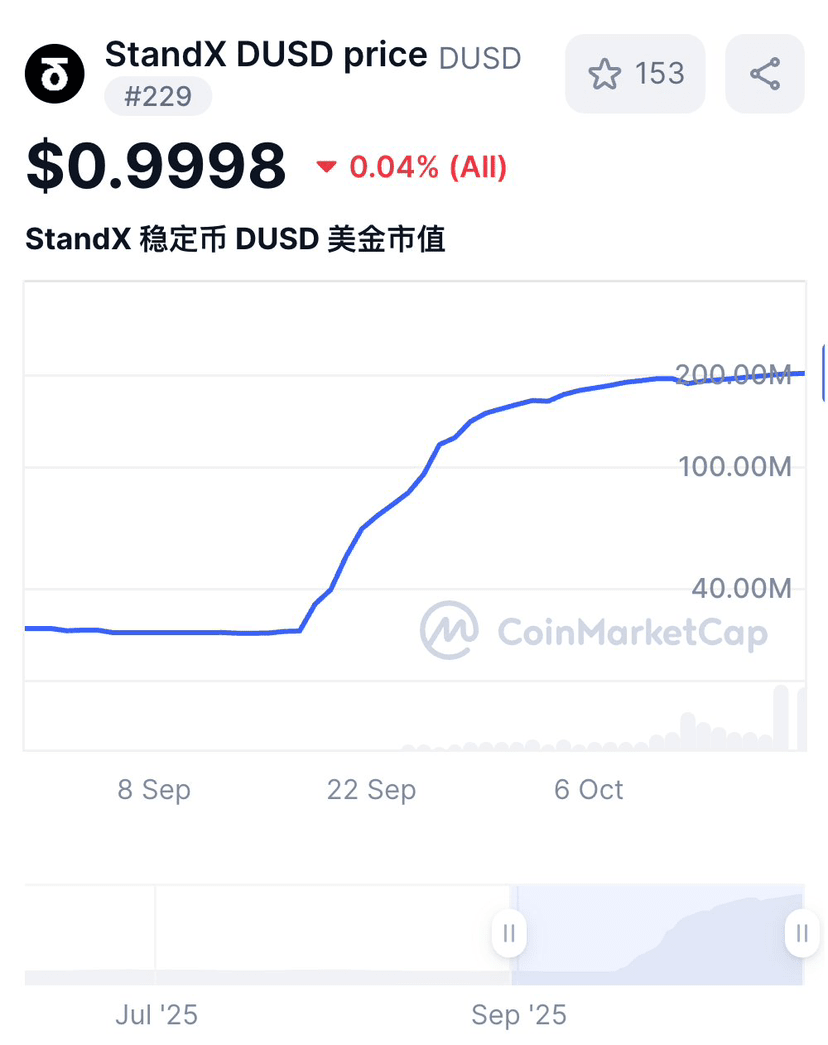 As ASTER's price hit a new low, StandX, a derivatives DEX platform on the same BNB chain, saw its BNB native stablecoin, DUSD, officially surpass $200 million in market capitalization within a month.
