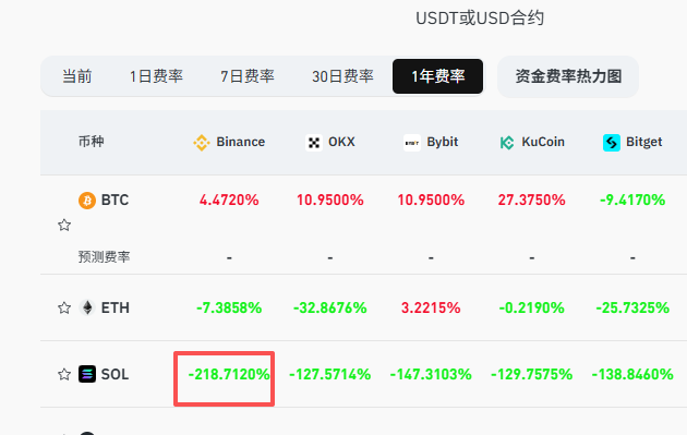 Binance 里 $SOL 永续合约的负费率创造今年最高了。 如果你现在还有任何形式的现货 SOL,给它卖掉换成 U,再原地开 1:1 等额的多单,敞口不变。 静态地看,相当于薅到空军 SOL 币本位年化无损 220% APR。 【非财务建议】