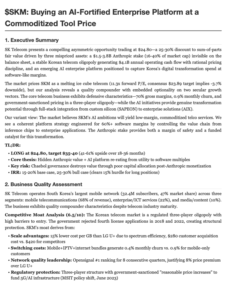 Then I found $SKM, but due to other cryptocurrency-related matters, I didn't have time to delve deeper, so I asked my AI analyst to help analyze it. 25 minutes later, I received a report summarizing the analysis. According to my AI analyst, Anthropic's holdings likely account for between 16% and 40% of its market capitalization.