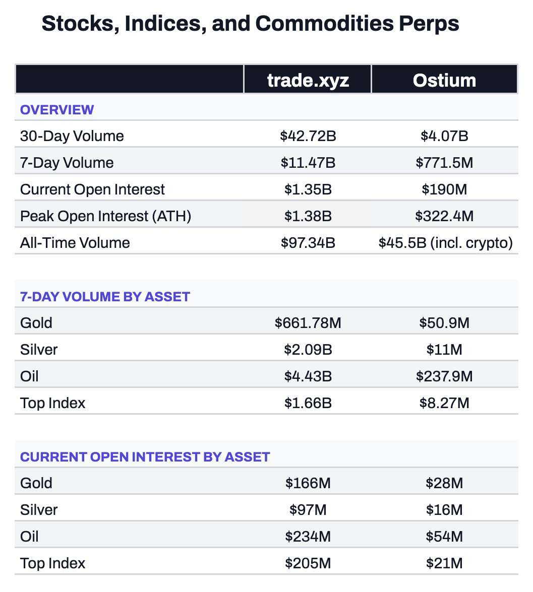 我将近期指标与 @OstiumLabs(该领域的主要竞争对手)进行了比较。