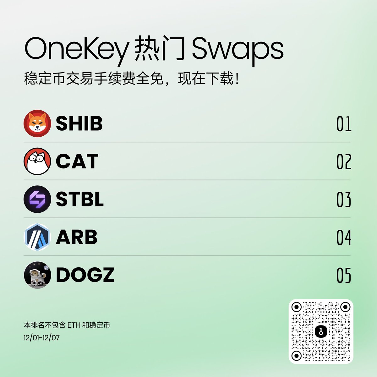 本周 OneKey Swap 交易榜 Top 5 来啦 (不含 ETH 和稳定币)! 1️⃣ $SHIB 2️⃣ $CAT 3️⃣ $STBL 4️⃣ $ARB 5️⃣ $DOGZ 你的持仓上榜了吗 轻松购买你喜欢的代币,就用 OneKey App 👇