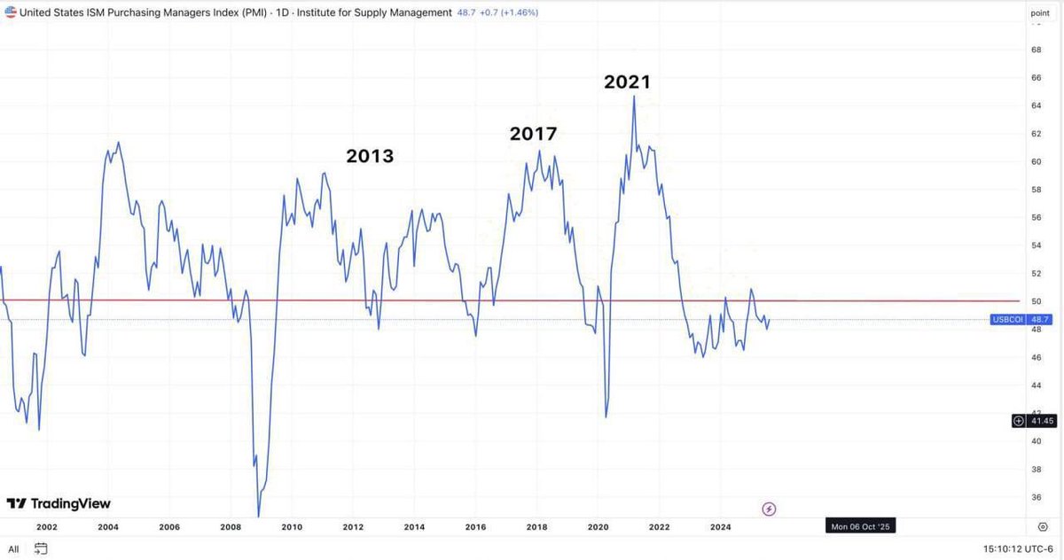 历史上每一次加密货币牛市(2013年、2017年和2021年)都发生在ISM指数突破50点之后。 昨天我们触及了52.6点。 自2021年以来,整个周期中ISM指数都低于50点,只有极小的波动。 这是迄今为止本周期中最大的一次上涨。 继续保持强劲势头。