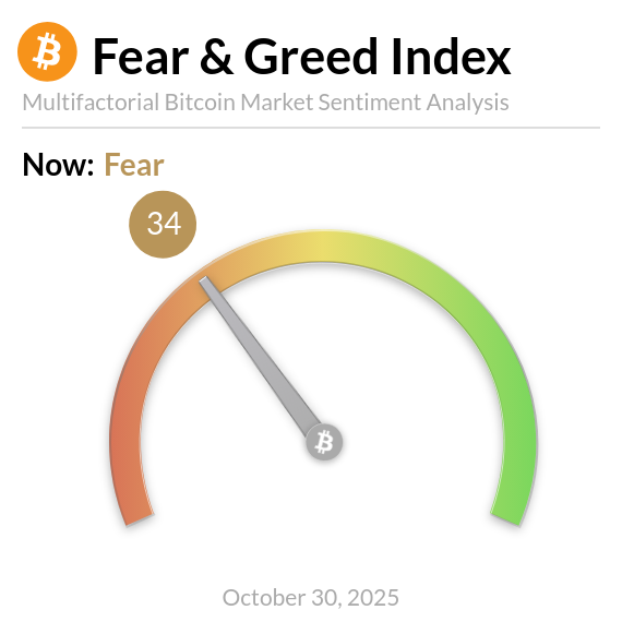 比特币恐惧与贪婪指数为 34。恐惧 当前价格:108,864 美元