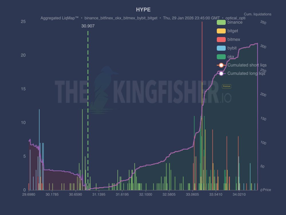 A large number of short positions in $HYPE are piled up above 33.06, which could trigger a cascading risk if triggered.