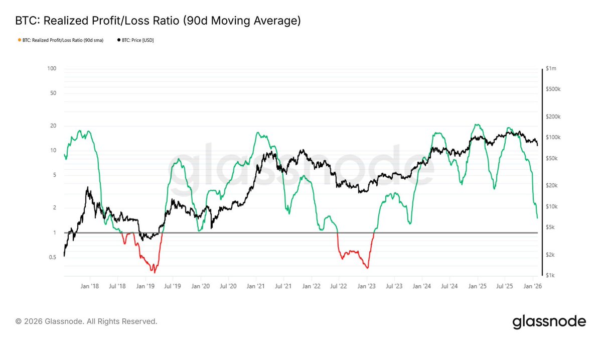 🚨 Alert: Glassnode data shows that Bitcoin's realized profit/loss ratio is close to 1, a level historically associated with market crashes.