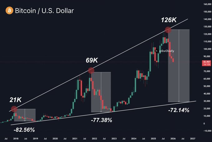If we calculate based on a maximum retracement of 70% for Tesla and Nvidia, the bottom would be approximately $38,000 ($126,000 x 0.3).