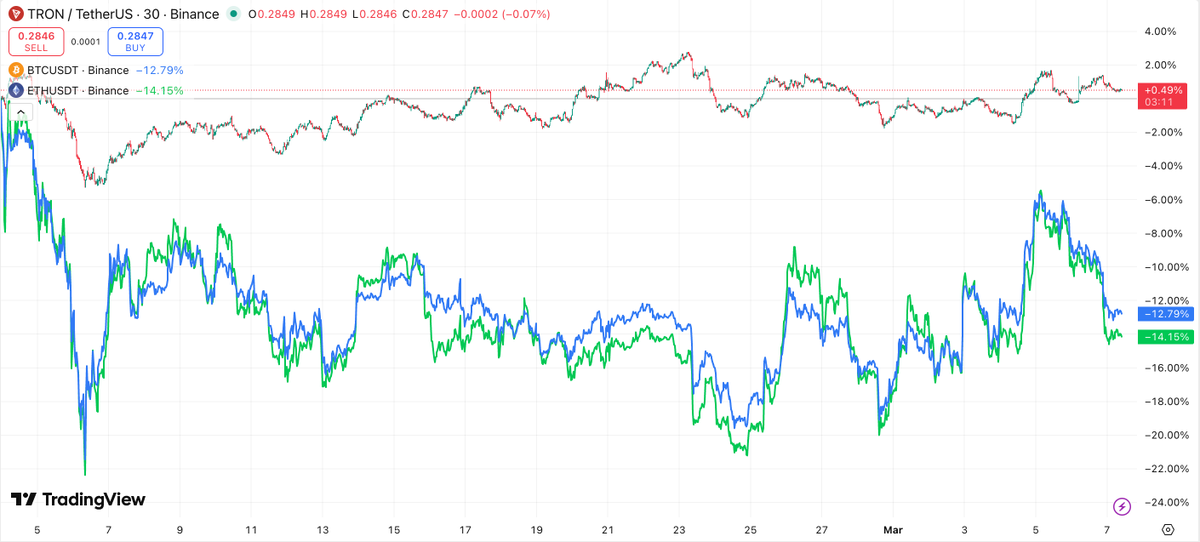 加密行业未解之谜:TRX为什么永远避险? 从图中可以看出 在这一个月的行情中 BTC和ETH来回反复波动 但TRX永远是稳如泰山 重点是还能一直跑赢大盘 几乎是主流中表现的最好的 @justinsuntron #TronEcoStar TRX为什么这么稳 @justinsuntron