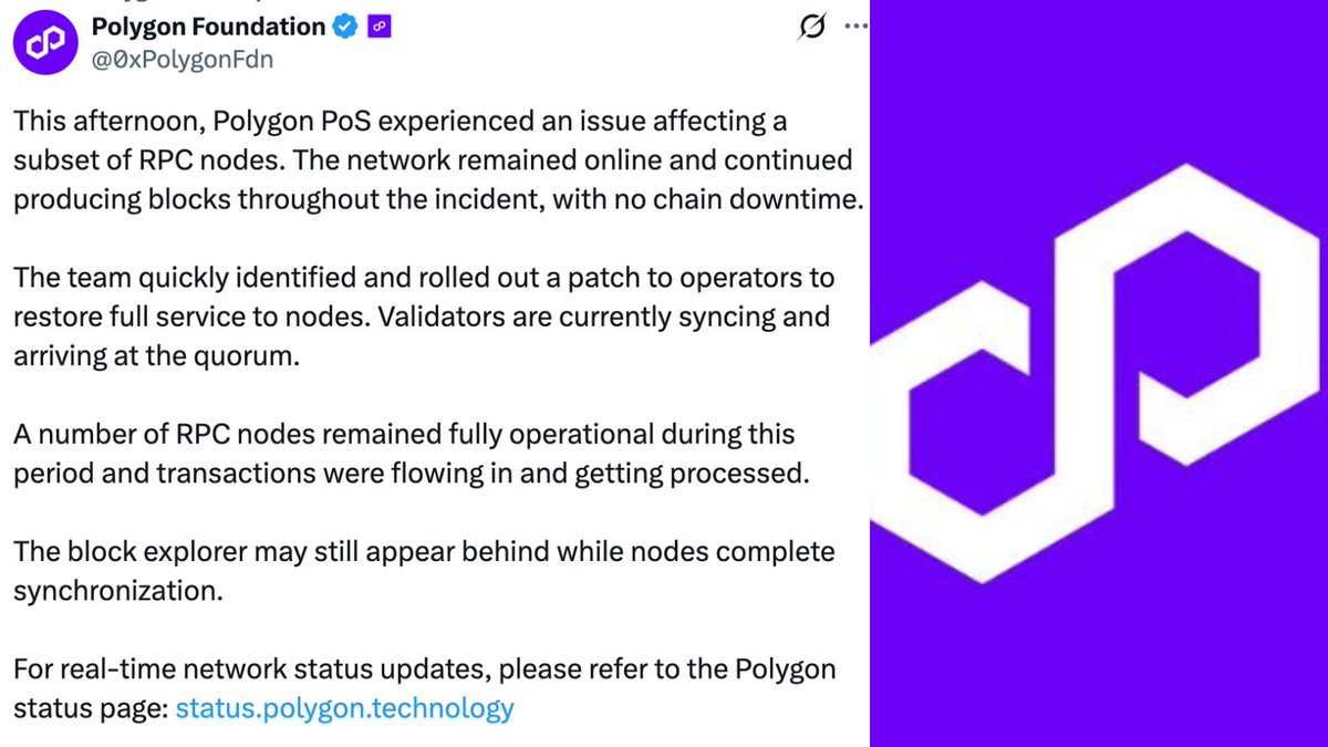 最新消息:@0xPolygonFdn 表示:“今天下午,Polygon POS 出现了一个影响部分 RPC 节点的问题。网络在整个事件期间保持在线并持续生成区块,没有出现链上中断。”