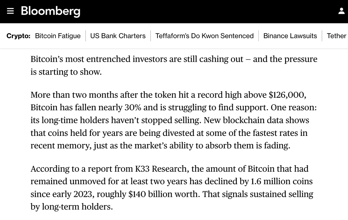 最新消息:彭博社报道称,“比特币最资深的投资者仍在套现——压力开始显现” 来源: