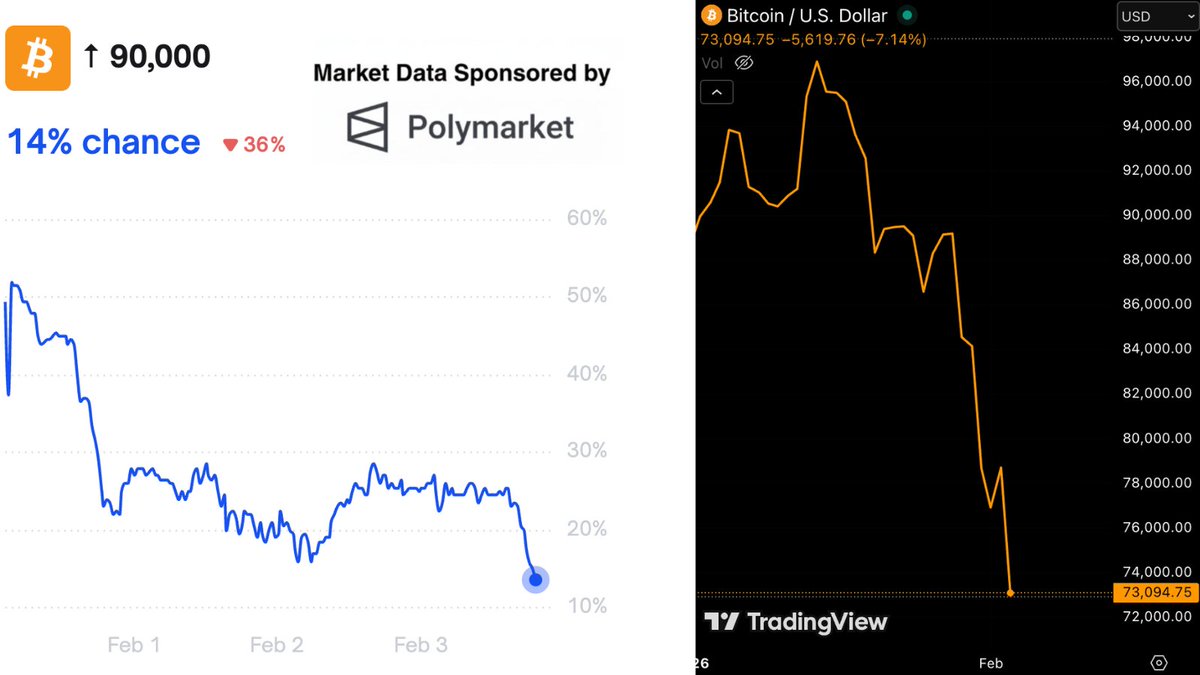 Breaking news: According to Polymarket's forecast, the probability of Bitcoin reaching $90,000 in February has dropped to 14%.