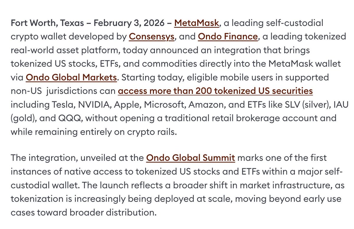 Breaking news: MetaMask announced that it will integrate tokenized US stocks, ETFs, and commodities directly into the MetaMask wallet via Ondo Global Markets, targeting eligible mobile users outside the US. Source: