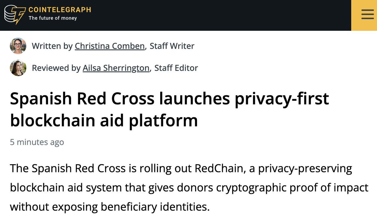 Breaking News: Spanish Red Cross Launches Privacy-Focused Blockchain Aid Platform - CoinTelegraph Source: