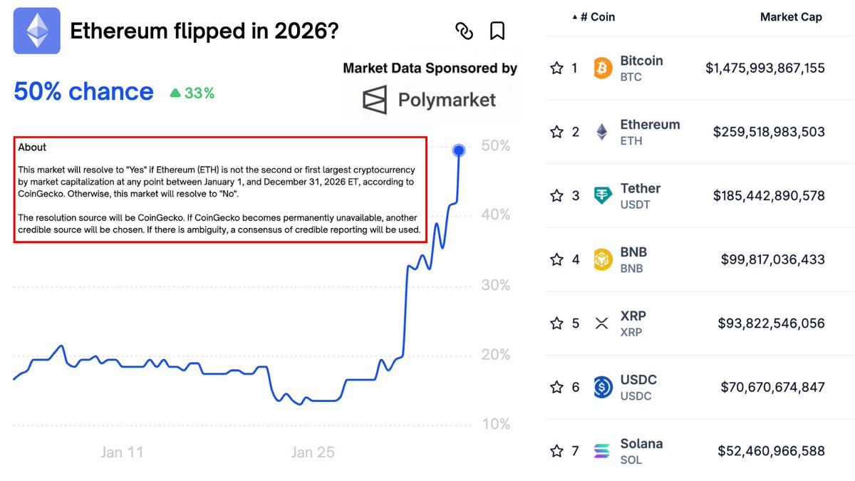Breaking news: According to Polymarket's forecast, the probability of Ethereum ($ETH) turning its market capitalization around in 2026 has risen to 50%.