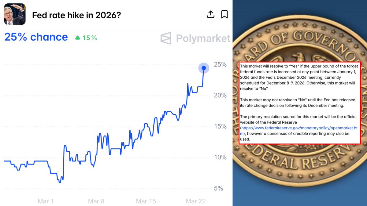 Breaking news: According to Polymarket's forecast, the probability of the Federal Reserve raising interest rates in 2026 has risen to 25%.