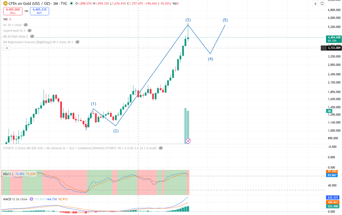 This round of gold price increases is driven by quarterly wave patterns. Currently, it's in the early stages of wave 4, and the volume at the top is very high. You can buy slowly after a pullback. No rush. With global volatility, don't act like a nouveau riche investing everywhere.
