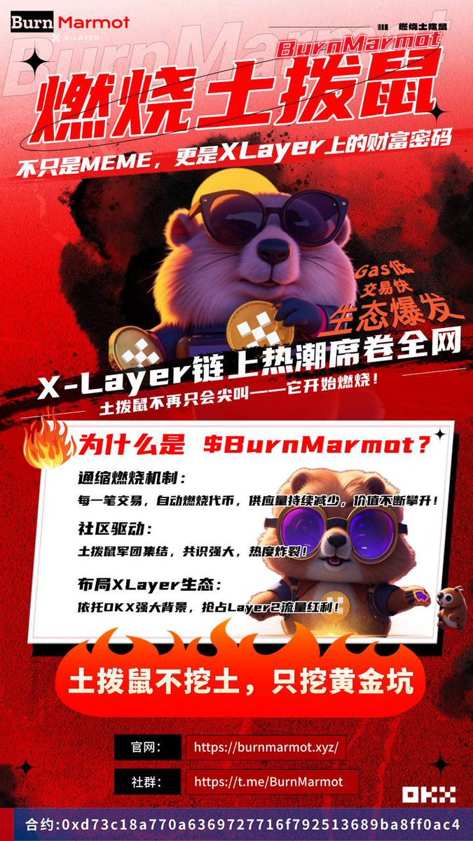 .@BurnMarmot 的 $BurnMarmot 燃烧土拨鼠,不只是MEME,更是XLayer的觉醒之作 最近 #XLayer 链上热潮席卷全网,Gas费低、交易快,生态爆发!土拨鼠不再只会尖叫——它开始燃烧 为什么是 $BurnMarmot ? ✅ 通缩燃烧机制:每一笔交易,自动燃烧代币,供应量持续减少,价值不断攀升! ✅ 社区驱动:土拨鼠军团集结,共识强大,热度炸裂! ✅ 布局XLayer生态:依托OKX强大背景,抢占Layer2流量红利! 土拨鼠不挖土,只挖黄金坑 官网: 社群: 合约:0xd73c18a770a6369727716f792513689ba8ff0ac4 #dyor