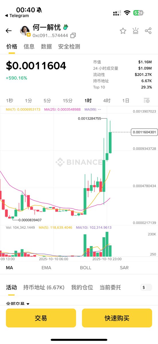 $何一解忧 这个谐音梗秒啊 想象空间太大了 叙事上来看,很大可能接棒 $客服小何 目前市值1M 还可以干 CA: 0xc0914df2f35e76e8870b515df3a29342b2574444