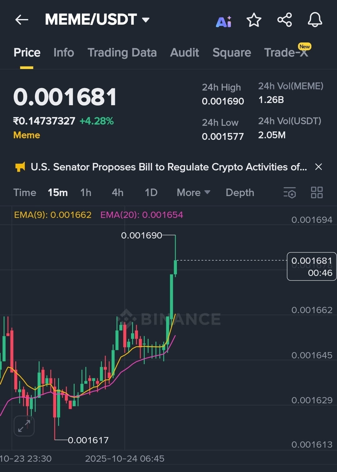 15 分钟线的 EMA(9) 和 EMA(20) 上方,K 线已然闪耀——模因魔力回归,趋势势不可挡! 💃💎