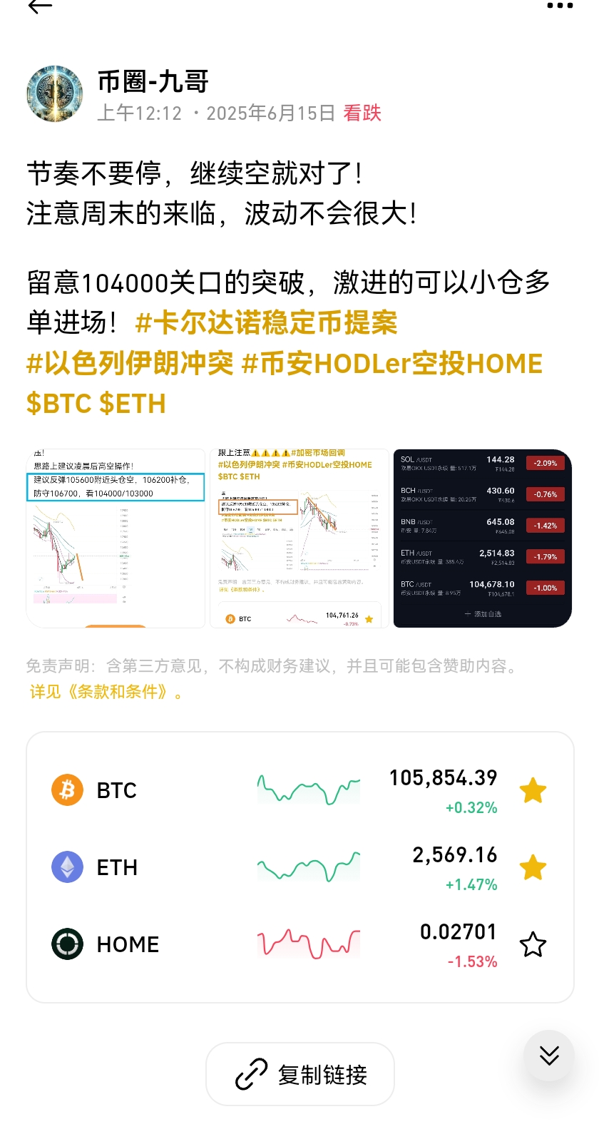 我们是激进派,行情指标走那边就分析那边! 从周线的整体来看,偏向震荡下行!小心短线的反弹是烟雾弹!短线中106500是重要的压制!这里也是近期的震荡箱的顶部,要想走出行情必须突破上去站稳上方才行,家人们需要特意注意币价的波动! 短线中目前报价105800,思路上建议在震荡箱的顶部附近空一次,性价比高!建议反弹106300附近空,防1070000,看104000/103000 【就是向上突破,也有机会放空单下车,站稳在换思路做多】