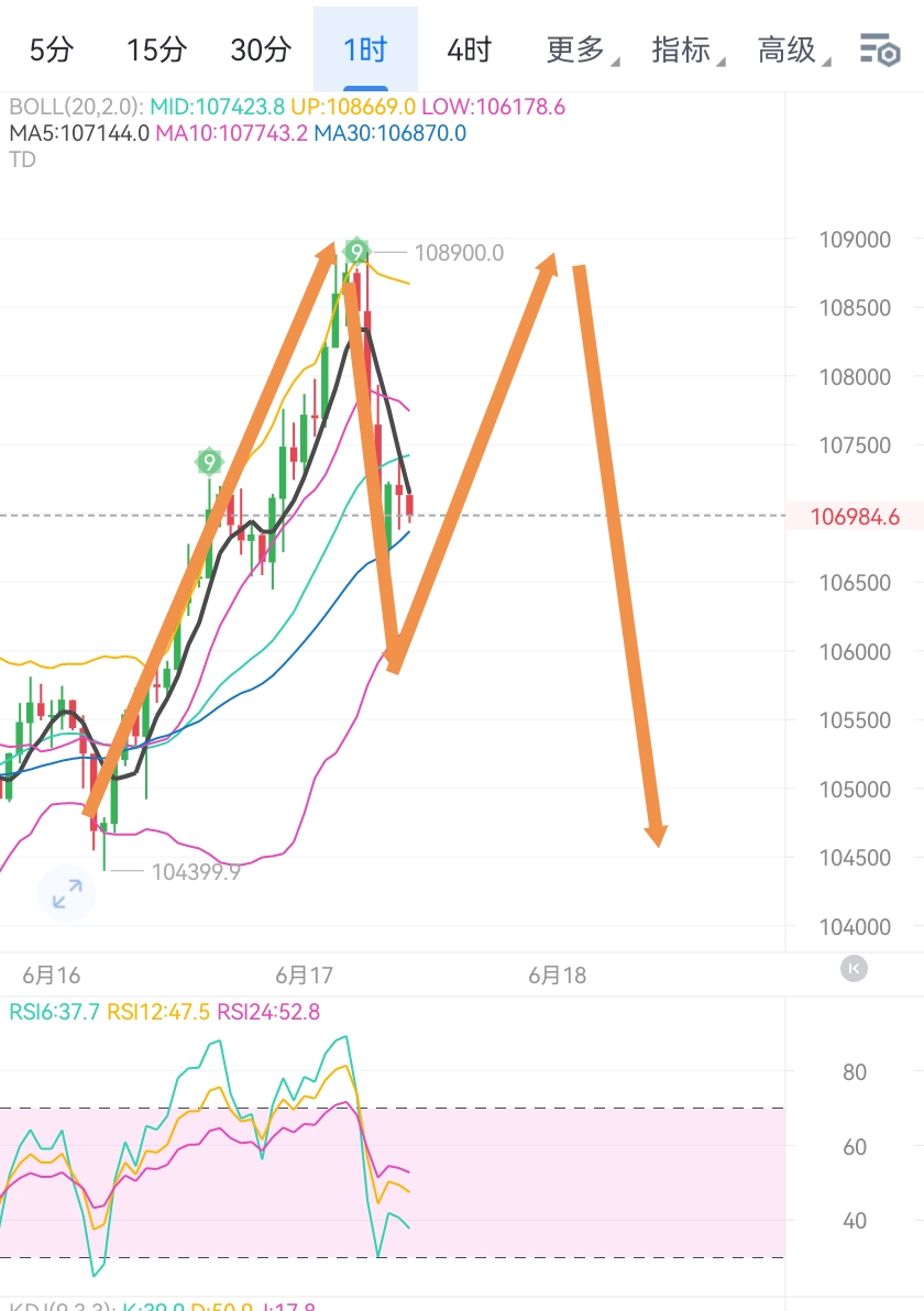 合约现在的基本规则! 能到4小时上轨分批做空! 下到4小时下轨分批做多! 大资金,小仓位的操作,基本不会怎么亏损! 现在走小时级别回调!力度不会很强了! 思路上建议低多操作,下方106200是多空分界线! 建议回调106400附近分批做多!看107500/108000