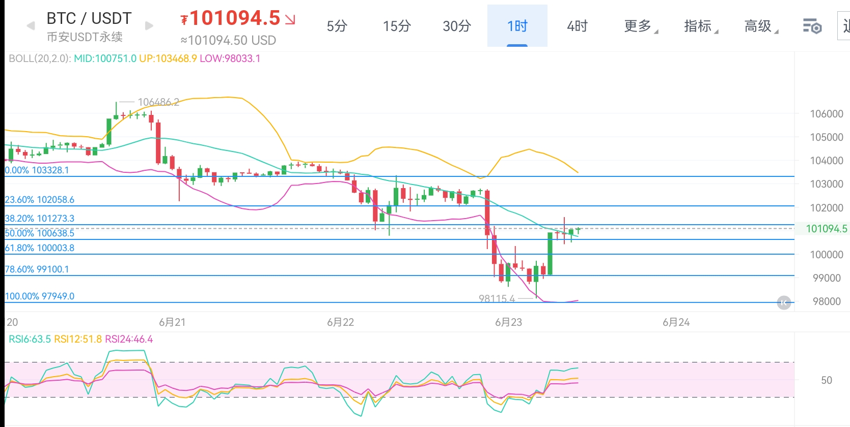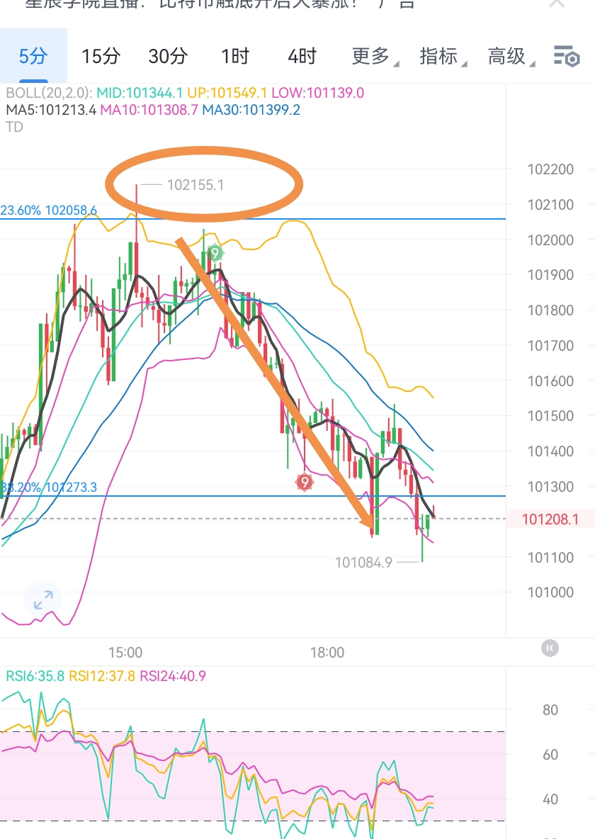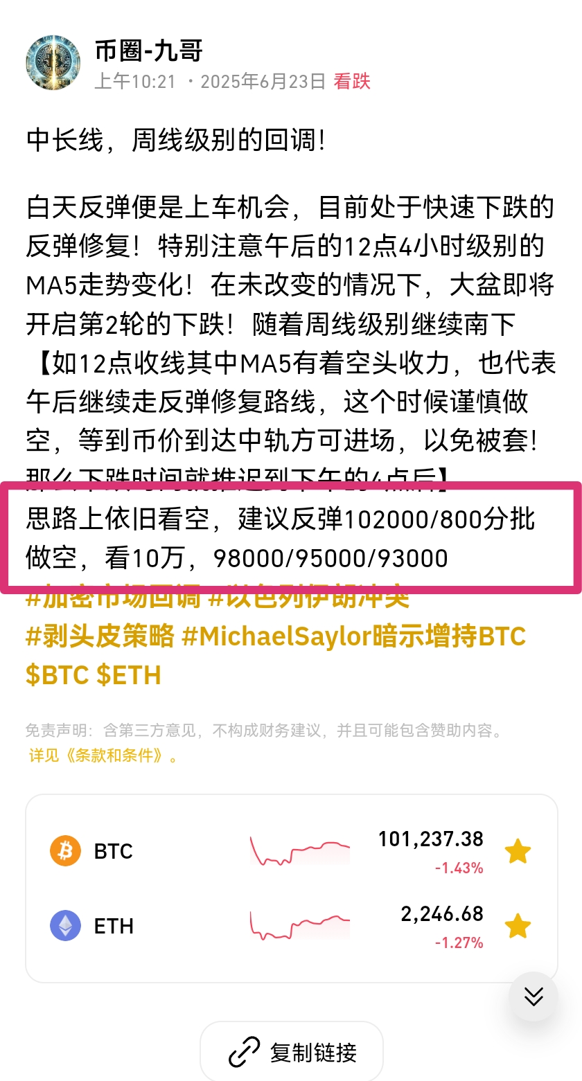 中长线,周线级别的回调! 白天反弹便是上车机会,目前处于快速下跌的反弹修复!特别注意午后的12点4小时级别的MA5走势变化!在未改变的情况下,大盆即将开启第2轮的下跌!随着周线级别继续南下 【如12点收线其中MA5有着空头收力,也代表午后继续走反弹修复路线,这个时候谨慎做空,等到币价到达中轨方可进场,以免被套!那么下跌时间就推迟到下午的4点后】 思路上依旧看空,建议反弹102000/800分批做空,看10万,98000/95000/93000