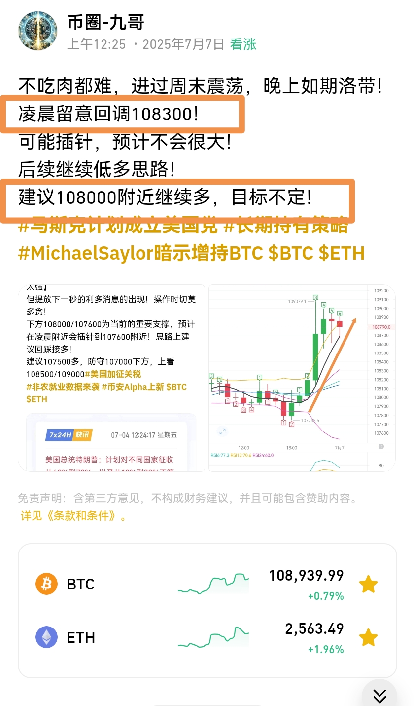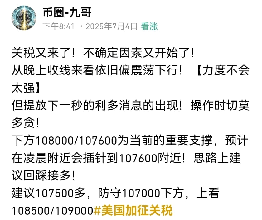 关税又来了!不确定因素又开始了! 从晚上收线来看依旧偏震荡下行!【力度不会太强】 但提放下一秒的利多消息的出现!操作时切莫多贪! 下方108000/107600为当前的重要支撑,预计在凌晨附近会插针到107600附近!思路上建议回踩接多! 建议107500多,防守107000下方,上看108500/109000