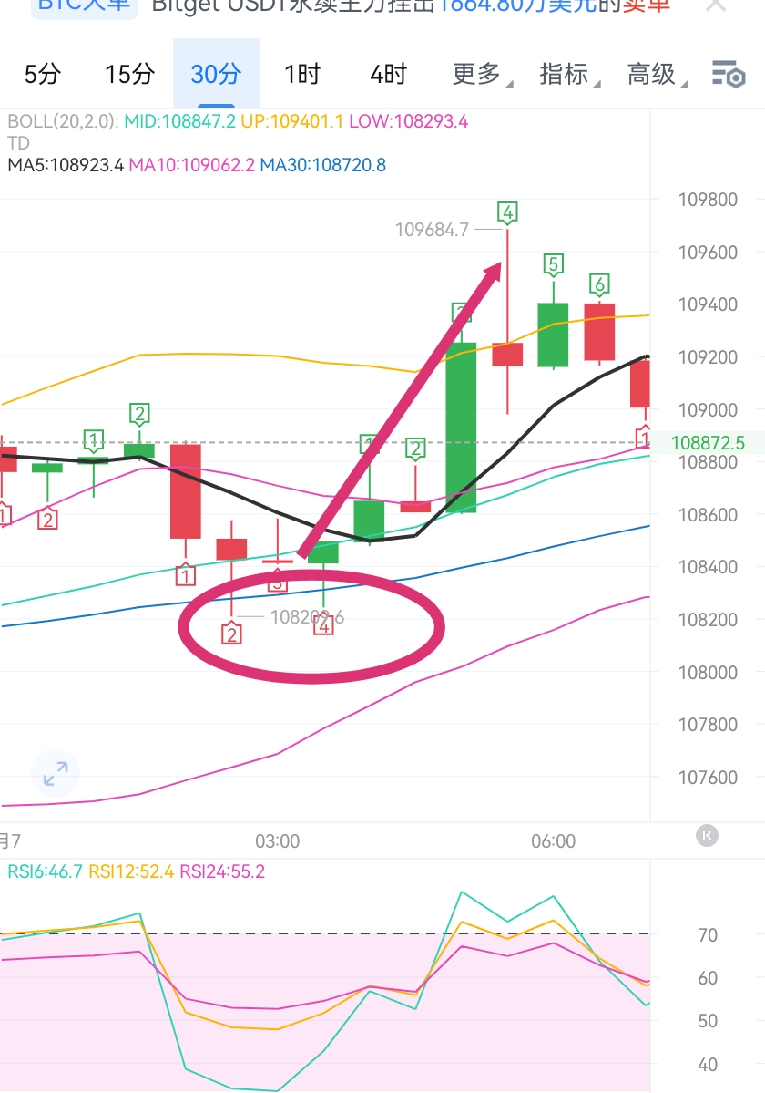 不吃肉都难,进过周末震荡,晚上如期洛带! 凌晨留意回调108300! 可能插针,预计不会很大! 后续继续低多思路! 建议108000附近继续多,目标不定!