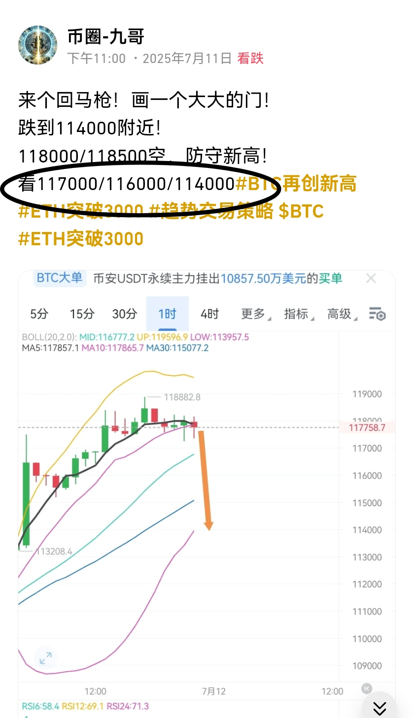 7/12号,周末了,经过前几天的放量上行,在昨晚我们空单进场也拿下1000余点空间! 基本这几天都没有像样的回调! 【目前周末应该泄力震荡修复,提别注意下周有大力度的回调】 周末应该在区间震荡为主,下方107000,上方108500! 建议高空为主,首次触及118300空,防守新高,下看117200/116500