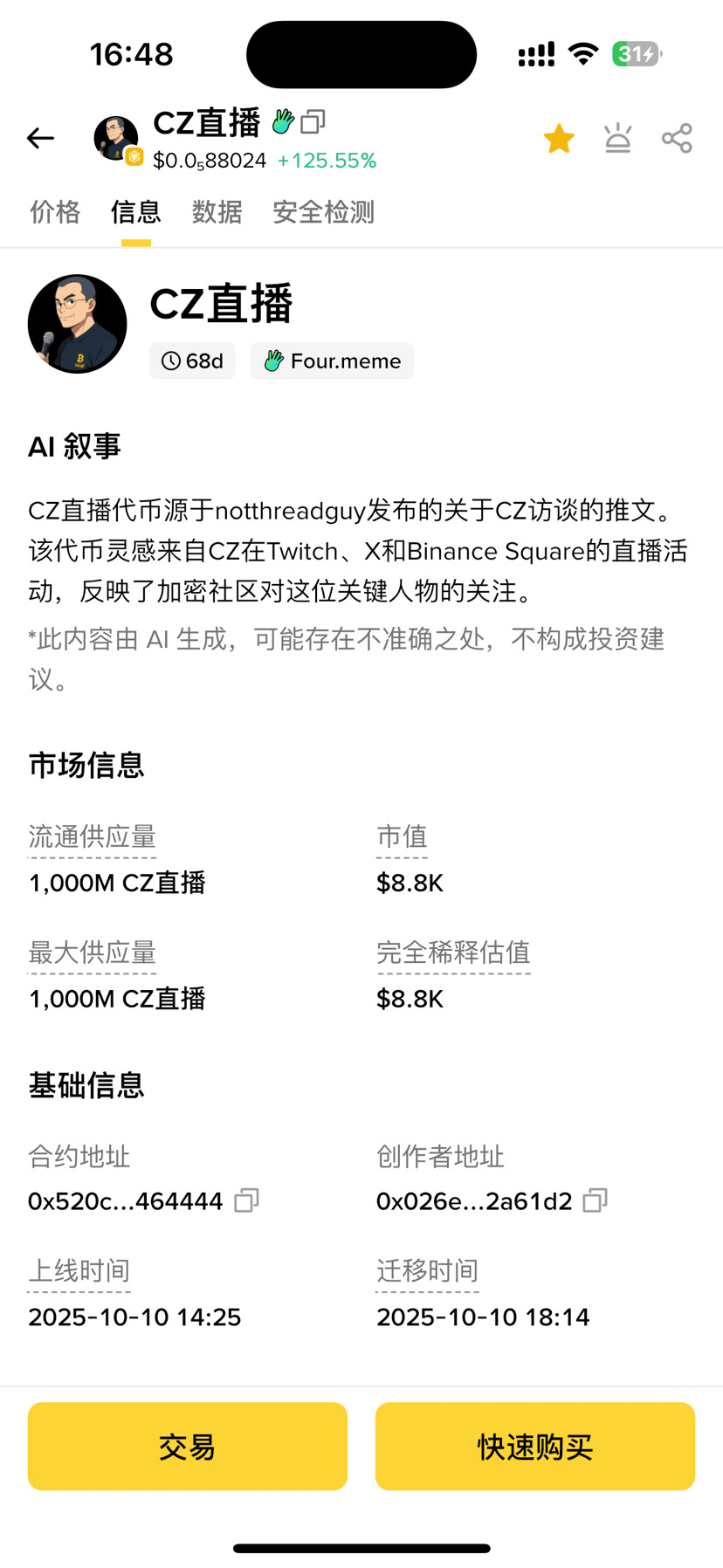 超级土狗CZ直播!CZ将在明日直播,可以埋伏一手该土狗,可以埋伏10刀20刀,当买个彩票了! #MEME $BNB 合约地址 0x520c734171498fa4574d43fa42eec4d0dd464444