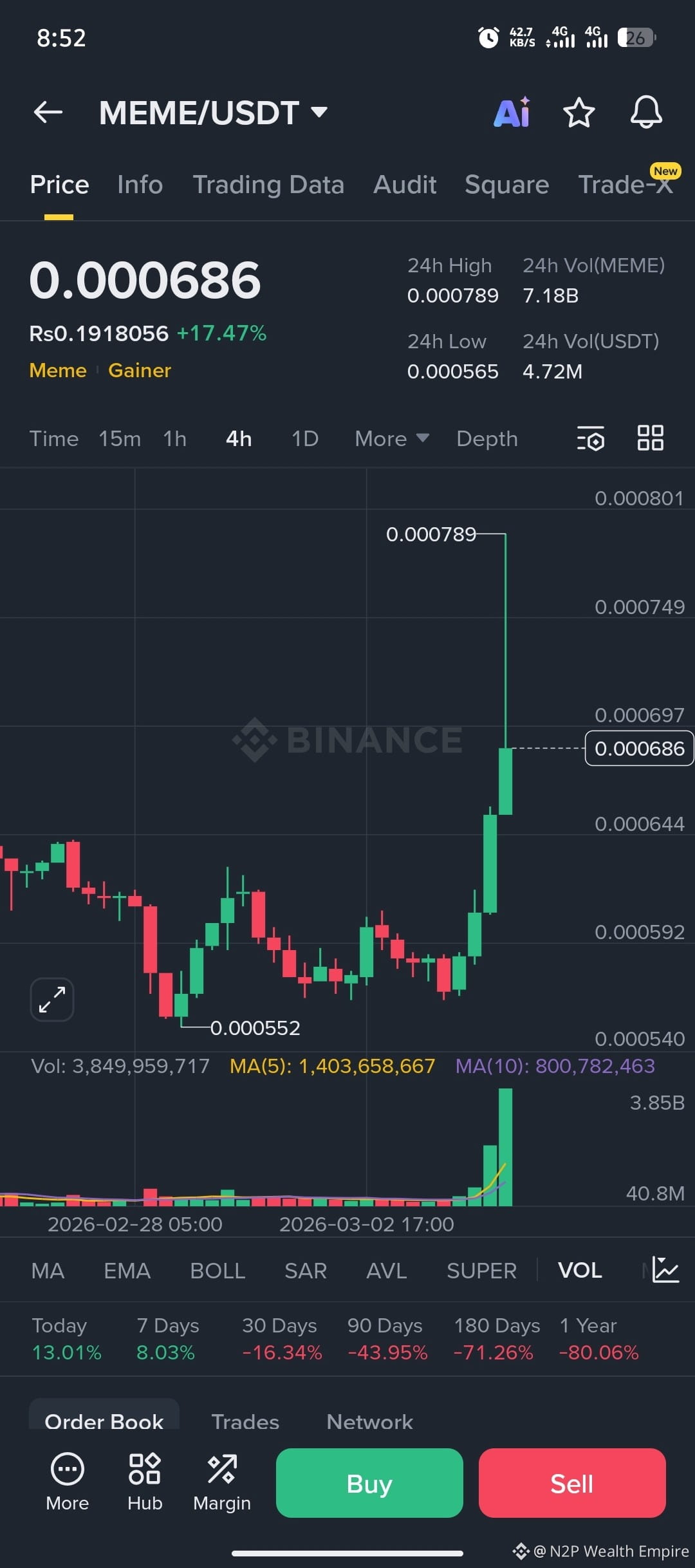$MEME is showing strong momentum to rebound from its lows on the 4-hour chart. After forming a bottom near $0.000552, the price experienced a sharp vertical rise and is currently trading around $0.000686 (+17%). 💪