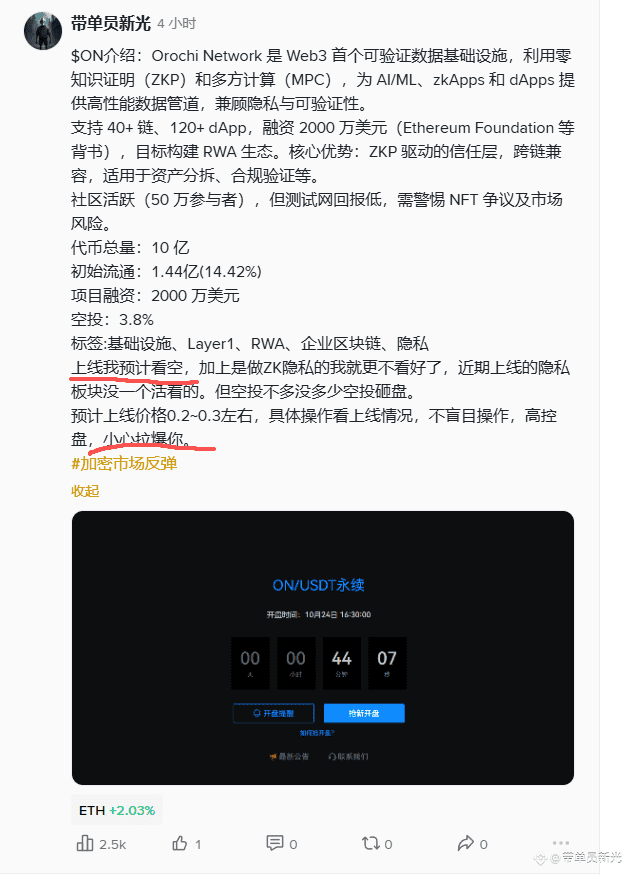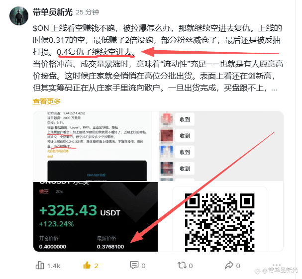 $ON 上线看空赚钱不跑,被拉爆怎么办,那就继续空进去复仇。上线的时候0.317的空,最低赚了2倍没跑,部分粉丝减仓了,最后还是被反抽打损。0.4复仇了继续空进去。 当价格冲高、成交量暴涨时,意味着“流动性”充足——也就是有人愿意高价接盘。这时候庄家就会悄悄在高位分批出货。表面上看还在创新高,但其实筹码正在从庄家手里流向散户。一旦出货完成,买盘跟不上,行情立刻反转。持续操作山寨,还有位,想跟的来!!! $COAI $APR #CPI数据来袭 {future}(COAIUSDT)