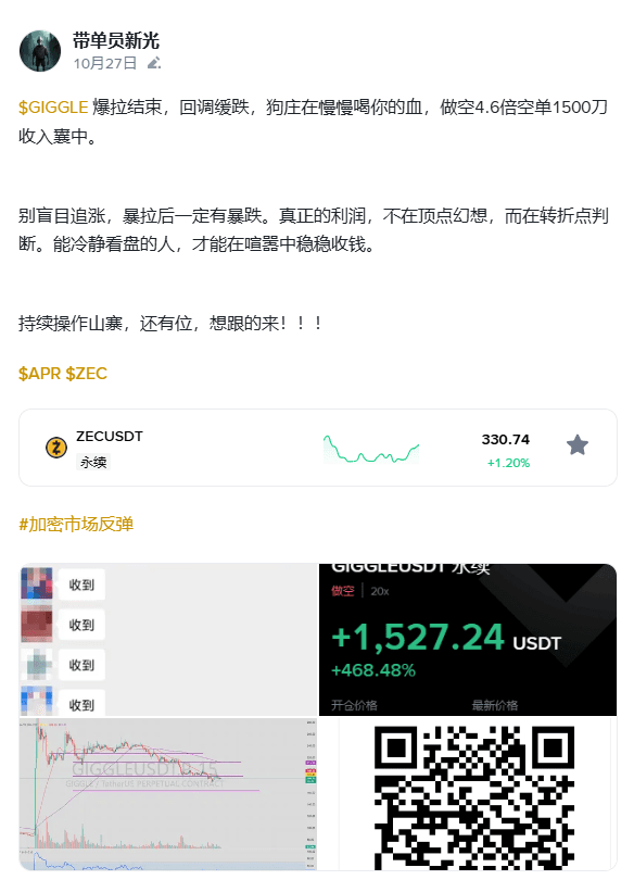 $GIGGLE 爆拉结束,回调缓跌,狗庄在慢慢喝你的血,做空4.6倍空单1500刀收入囊中。 别盲目追涨,暴拉后一定有暴跌。真正的利润,不在顶点幻想,而在转折点判断。能冷静看盘的人,才能在喧嚣中稳稳收钱。 持续操作山寨,还有位,想跟的来!!! $APR $ZEC {future}(ZECUSDT) #加密市场反弹