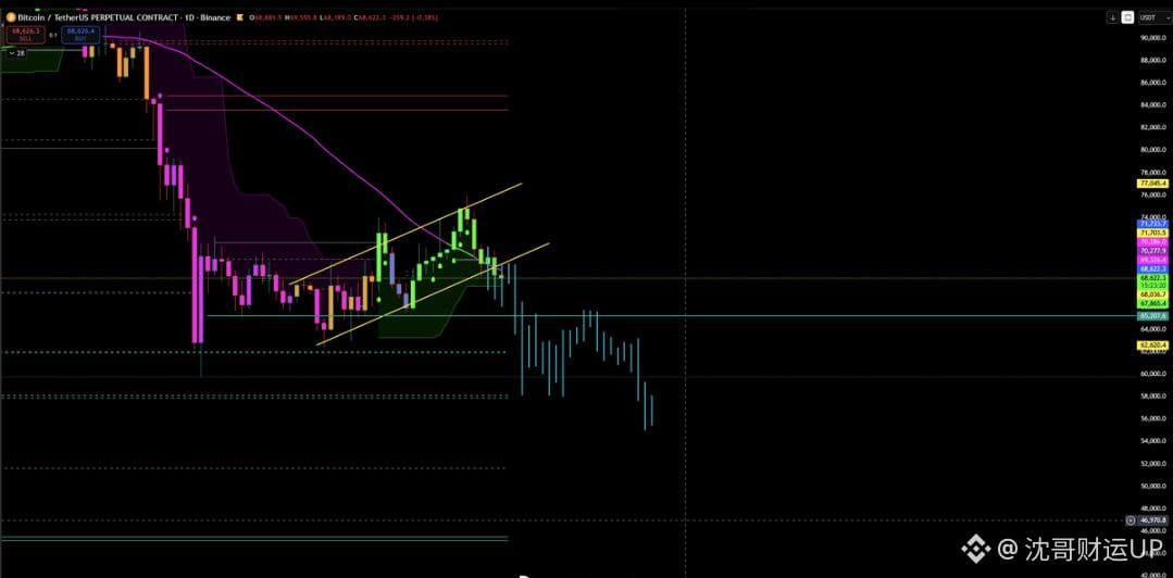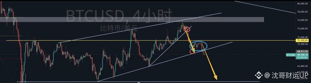 BTC's 4-hour chart shows a very rhythmic decline, breaking through minor support levels and accelerating the drop.