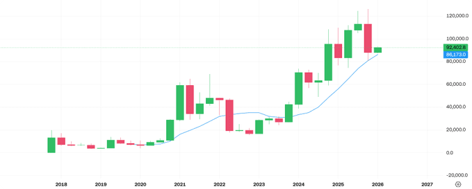 Now it's 2026, and it's only just begun. Following this pattern, the first half of this year should see two consecutive quarters of gains, ushering in a massive bull market. BTC reaching new highs shouldn't be difficult!