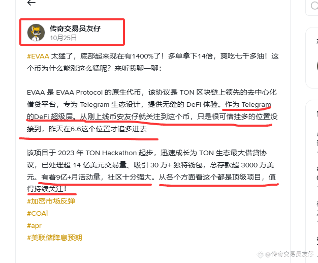 #EVAA 我靠!!你永远可以相信友仔!在25号发文章让你们持续关注的evaa,今天又暴涨了48%。可惜的是,我的多从6刀吃到11刀就出了,难受啊,看着你们赚钱! #加密市场回调 #中美贸易谈判