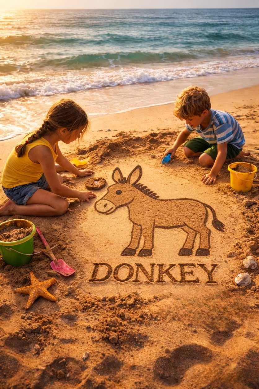 The sea breeze caresses the fine sand, feel the joy of the starry sky and the vast ocean. On this New Year's beach, the playful little donkey #DONKEY stands out.