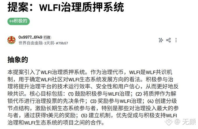WLFI (@worldlibertyfi) recently proposed a "governance staking system," requiring tokens to be locked for at least 180 days to gain voting rights. This aims to encourage long-term commitment and prevent short-term speculation from dominating the market.