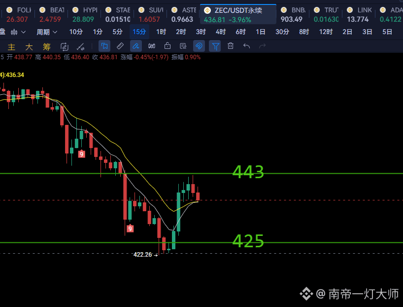 #ZEC Daily Smart Strategy I entered a short position on ZEC at 443 in the live stream. Currently, I'm up $7, so I can set a stop-loss at the cost price. I've arranged some late-night snacks and beer for everyone tonight. Have a great weekend and goodnight...