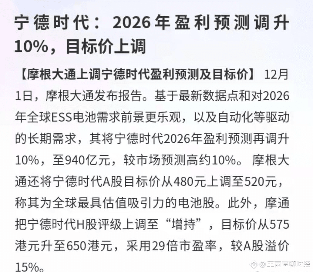 CATL: 2026 earnings forecast raised by 10%, target price increased.