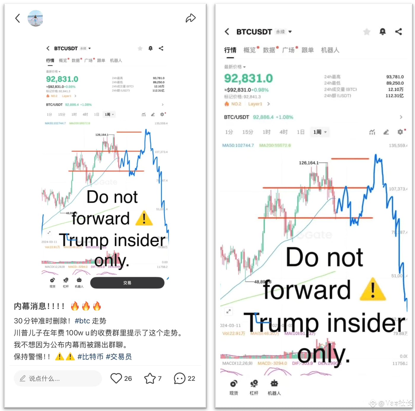 小某书上的“内幕”消息,川普儿子在100万u的收费群里提示的走势。要不是这个中文截图,我差点真信了😂 虽然是篇搞笑消息,但其实也反应了大家对目前市场的看法。普遍其实是看向走熊的。 只是一部分人认为会直接熊下去,另一部分人认为会跟图里的差不多,再打一浪后才会走熊。 社长目前是第一种看法,广场的大家怎么看呢? #BTC走势分析