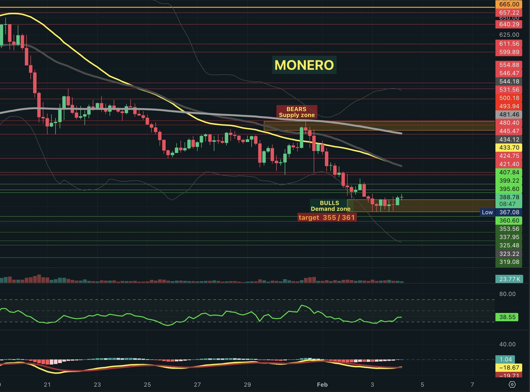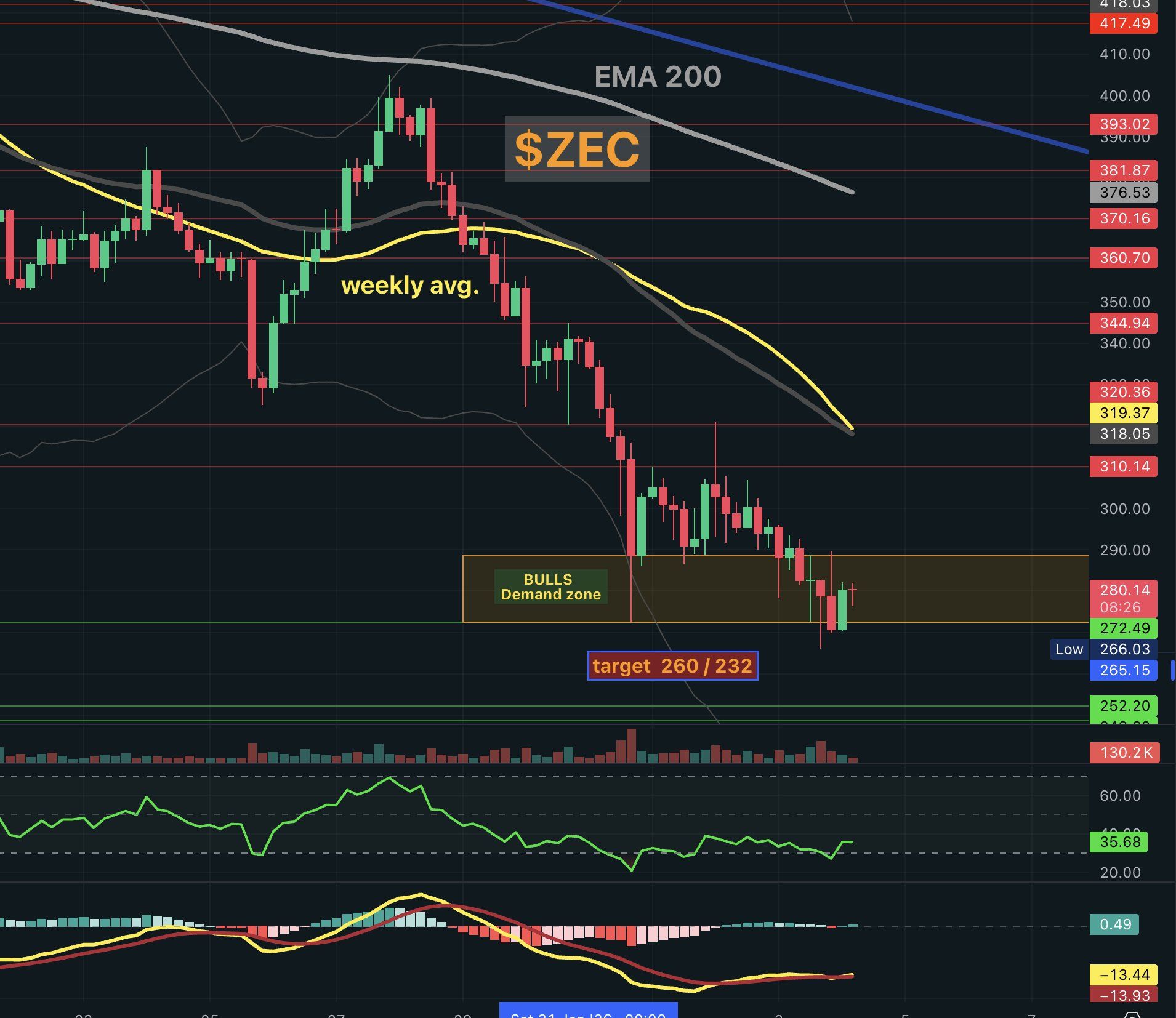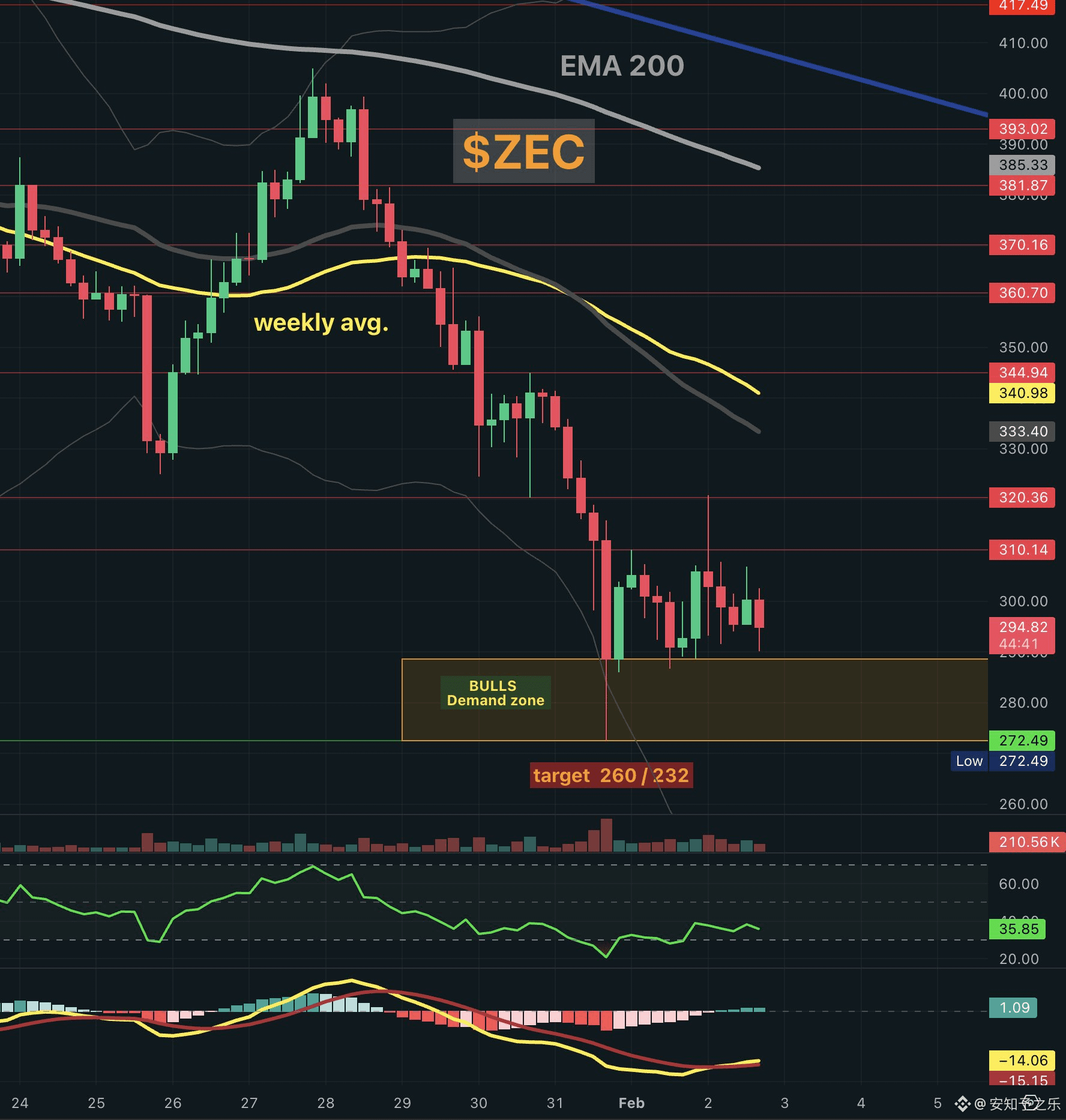 If the market experiences an out-of-control, rapid sell-off later, I'll consider deeper target levels: for XMR, I'll be watching around $321-$325, which is the one-year average price area; for ZEC, I'll be looking at around $235, corresponding to the strong monthly support zone of $234 that I mentioned before.