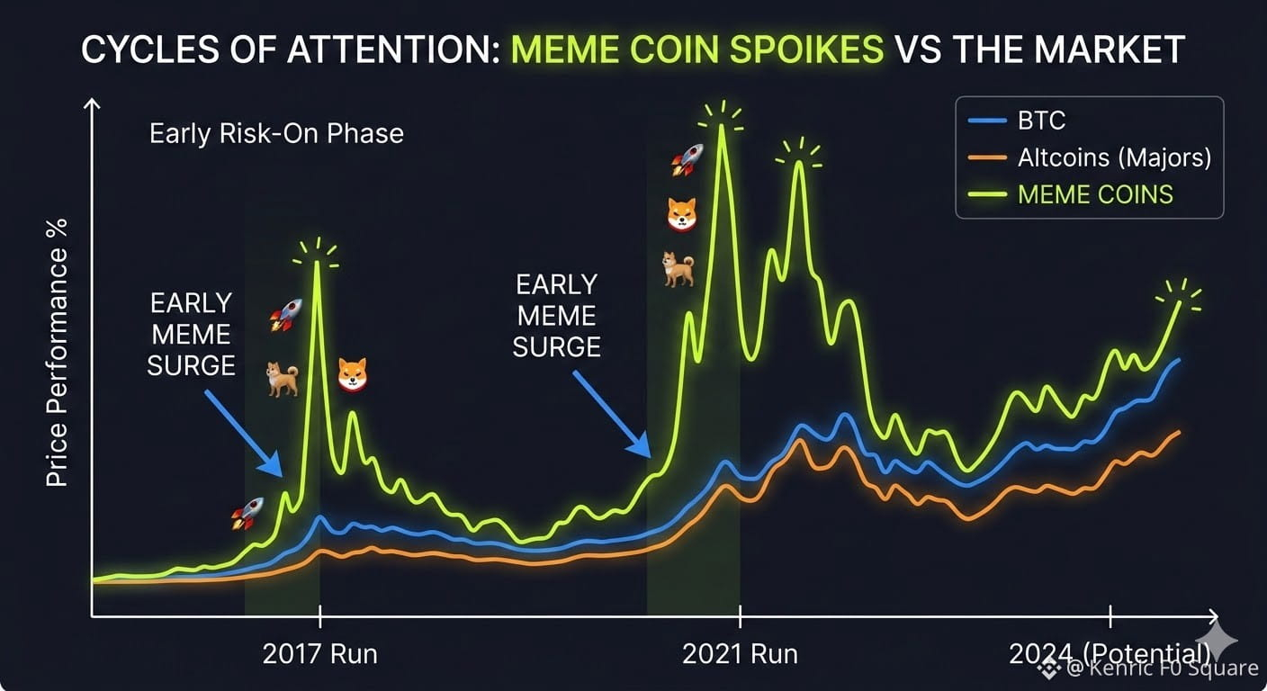 In past cycles, memes have generally seen the largest gains in the early stages of increased risk appetite.
