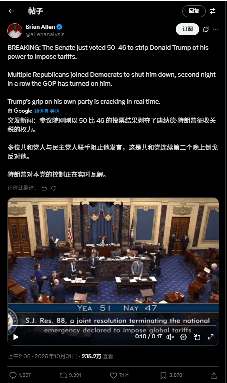 当地时间10月30日,美国参议院以51票对47票通过决议,正式寻求终止特朗普总统实施的全面关税政策。这项联合决议旨在推翻特朗普为征收全球关税而宣布的"国家紧急状态",标志着国会两党对现行贸易政策的明确反对。