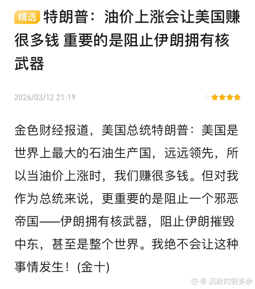 从赚钱角度讲,希望美伊战争持续。毕竟我和身边朋友布局的都是抗通胀资产,两个月前也有讲过。 从现实角度讲,伊朗不应该如此剧烈的反抗,这种战争本身就不公平,而且刚建立的工业化体系,会迅速毁在战火之下,这世界已经很颠,而且不可能有国家能容下伊朗拥核。 再者讲一个没有完成工业化和数字化的国家,和美国进行战争,本身就不就不公平,没必要让战争持续造成更多伤亡。 伊朗挣不来核武,就像开战前讲,哈梅内伊拒绝川普提案必然挨打,实际上伊朗以目前的工业程度进展,再过十年完成简单数字化体系,核弹随时都可以搓出来,没必要执着当下是否拥有。 $BTC $ETH $LDO #btc #eth #ldo {spot}(LDOUSDT) {spot}(ETHUSDT) {spot}(BTCUSDT)